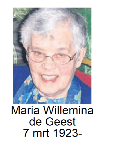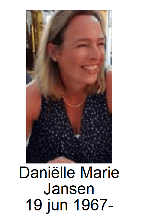 | XVu. | Foktje Johanna de Geest, dr. van Hendrik de Geest (XIVam) en Trientje Kok, geb. te Culemborg op 24 mrt 1958, tr. (27 jaar oud) op 6 mrt 1986 met Peter van Heusden. |