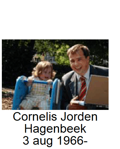 | XVk. | ir Jorden (Cornelis Jorden) Hagenbeek, zn. van ir Cees (Cornelis Jorden) Hagenbeek (XIVs) (directeur) en Mechelien (Mechelina) Mezach, geb. te Bussum op 4 dec 1972, ged. te Bussum op 4 feb 1973, civiel ingenieur, samen resp. ongeveer 27 en ongeveer 30 jaar oud te Amsterdam in 2000, tr. (resp. 34 en 37 jaar oud) te Champoussin [Zwitserland] op 4 jan 2007 met Leontine Maxwell, dr. van Neil (Felix Neil) Maxwell en Betty (Elizabeth Emelie) Klusman, geb. op 26 jul 1969, makelaar. |
